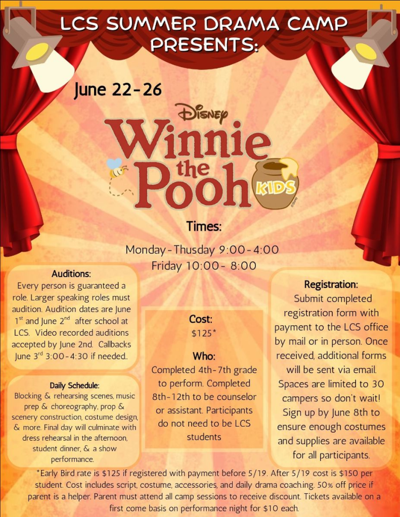 LCS Drama productions include a Fall Play and a Spring Musical. Mrs. Jenifer Welch directs our drama club in amazing entertainment! Take advantage of this wonderful experience and support LCS Drama.